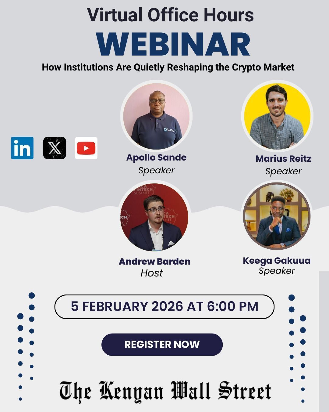 This coming week, Andrew Barden, CEO of The Kenyan Wall Street will moderate a webinar session will examine how global institutions are quietly reshaping the crypto market and what this evolution means for Kenya. Register your attendance here »»»»»