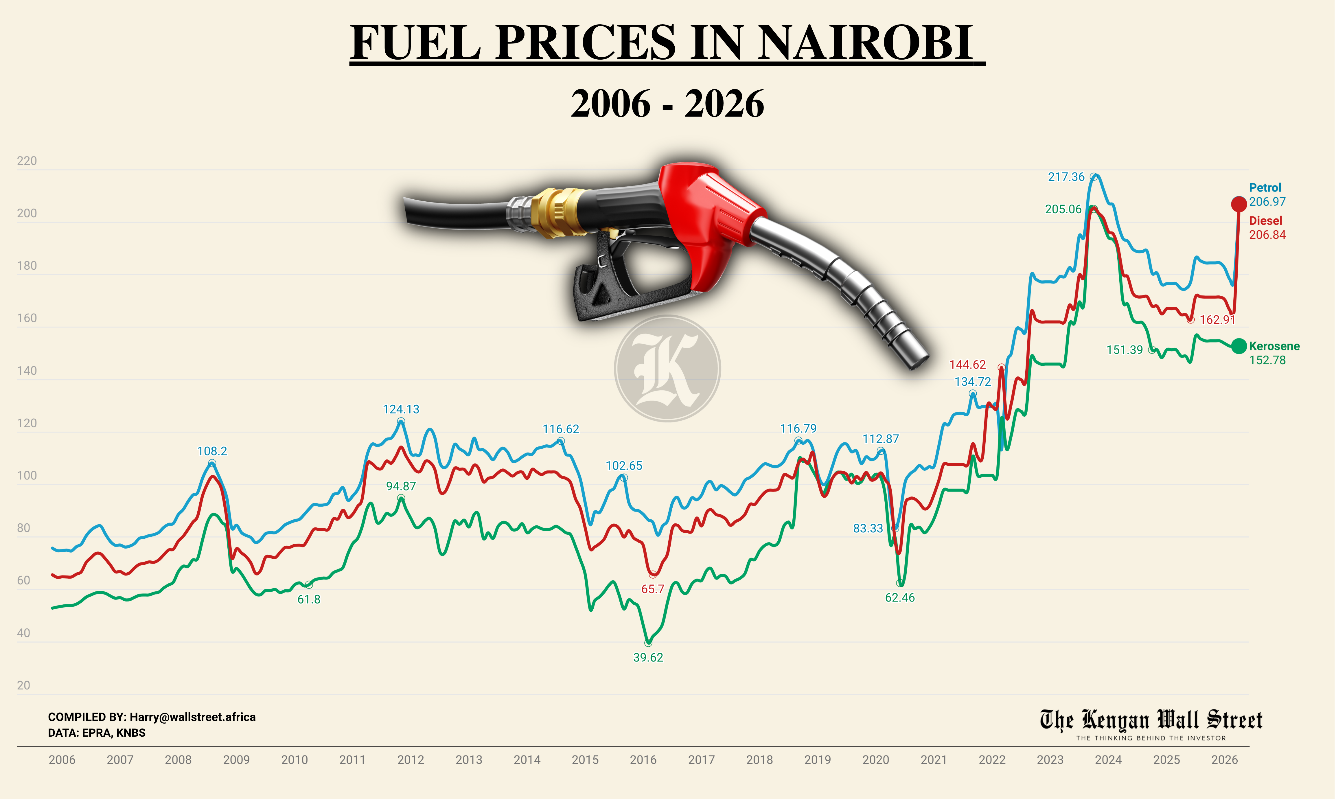 Fuel prices in Kenya have jumped sharply, with diesel now above KSh 206 per litre, the highest in history, and super petrol rising to nearly the same level, making everyday travel and business operations significantly more expensive. The increase comes after a surge in global oil prices linked to supply disruptions in the Middle East, along with a weaker shilling that raises the cost of importing fuel. Transport operators are expected to pass the higher diesel costs to consumers, which will push up the price of food and basic goods in markets across the country. Even kerosene, widely used by low-income households for cooking and lighting, remains heavily subsidized, masking a real cost that would otherwise be far higher and unaffordable for many families. The result is a broad rise in the cost of living, with fuel acting as the main pressure point feeding inflation across the economy.